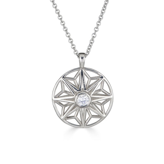 I designed it in CAD and due to the nature of the design, it cannot be cast, so each pendant is 3D printed and cast. I chose a gorgeous lab created 4mm emerald for the center stone on one side and a 4mm moissanite on the other side.