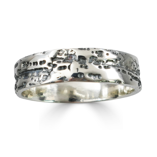 For an alternative men's wedding band, the texture on this sterling silver ring is inspired by sea foam at a beach. Each time you look at the ring, you'll see a different pattern. Great for a man that is looking for a wedding band that is a little bit different.